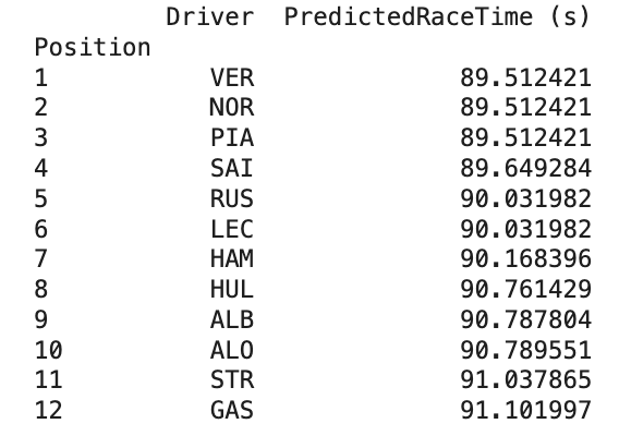 The five inputs feed into XGBoost (Extreme Gradient Boosting) a machine learning algorithm used across finance, medicine, and sports analytics worldwide. It learns the relationship between driver characteristics and race pace from historical data, then applies those patterns to predict the 2025 outcome.