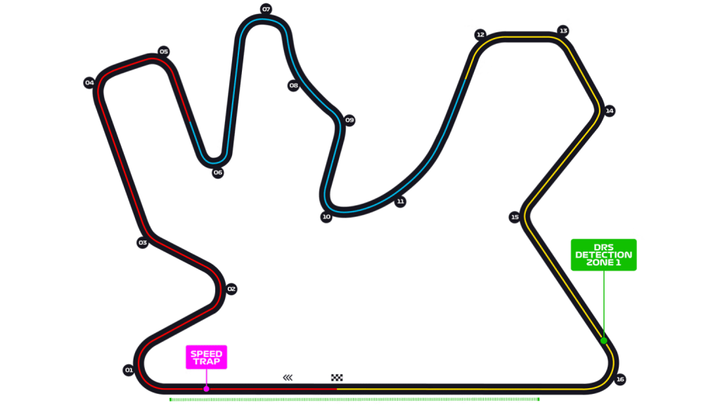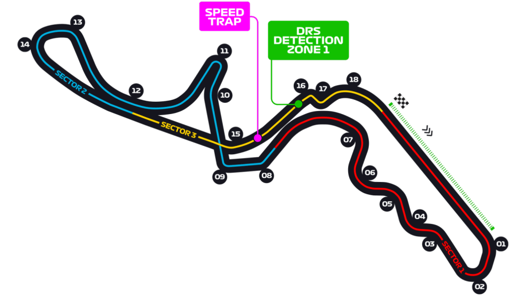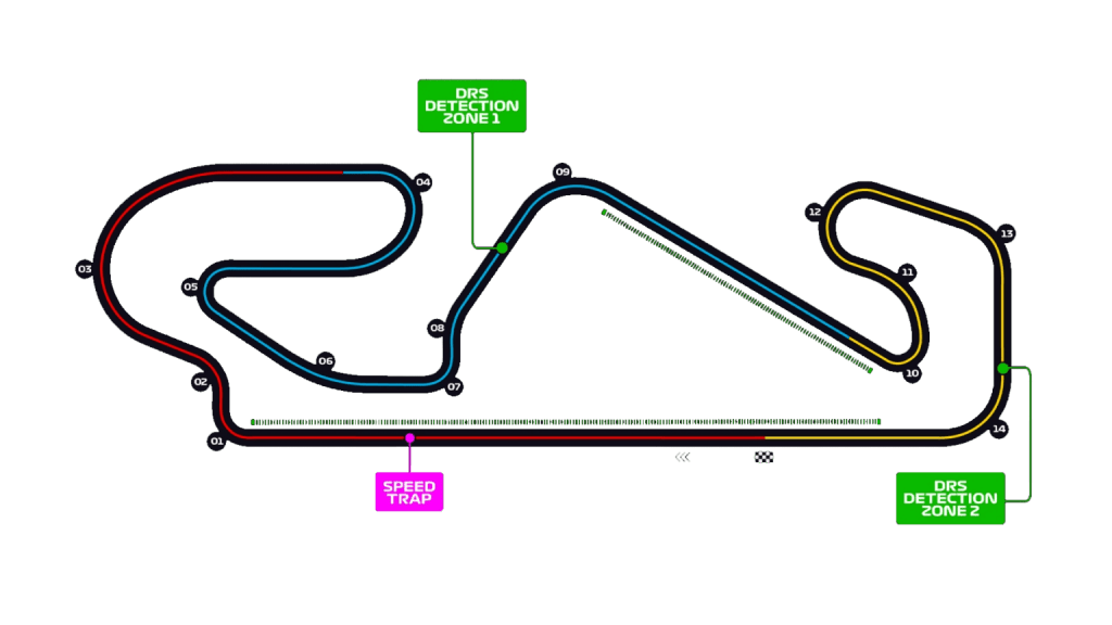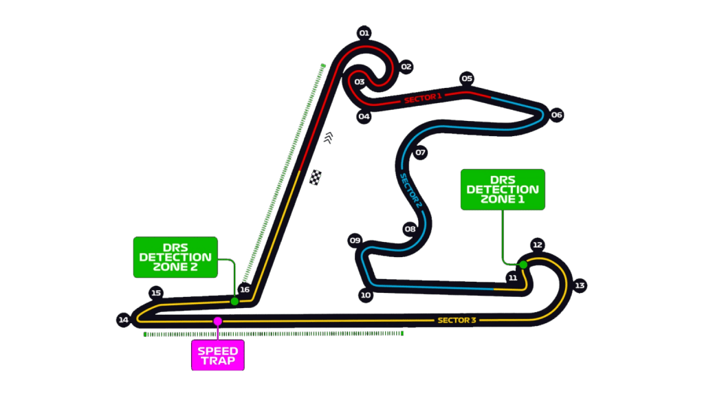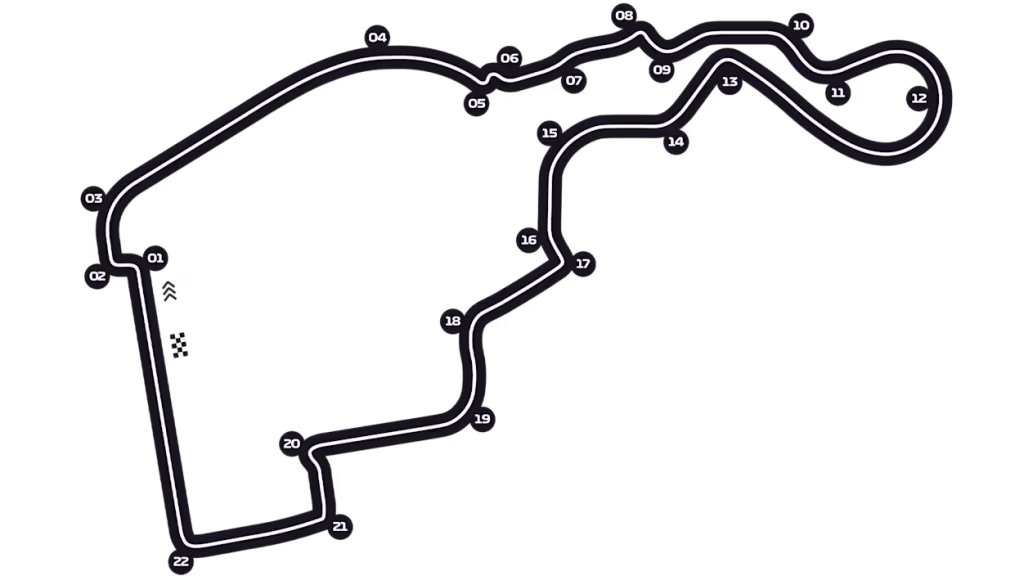 The heavy braking zones at Turn 11 and Turn 12 create key overtaking opportunities while the final sector demands traction and precise throttle control. Tyre wear can be high depending on track temperature, and bumps on the surface often influence mechanical setup. Teams must find a compromise between straight line efficiency and grip through the fast corners.