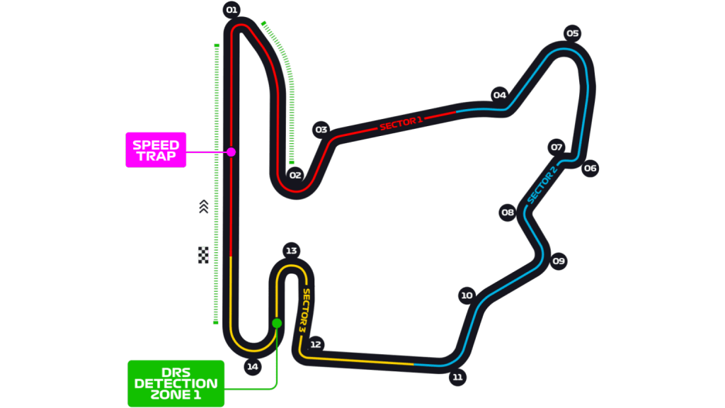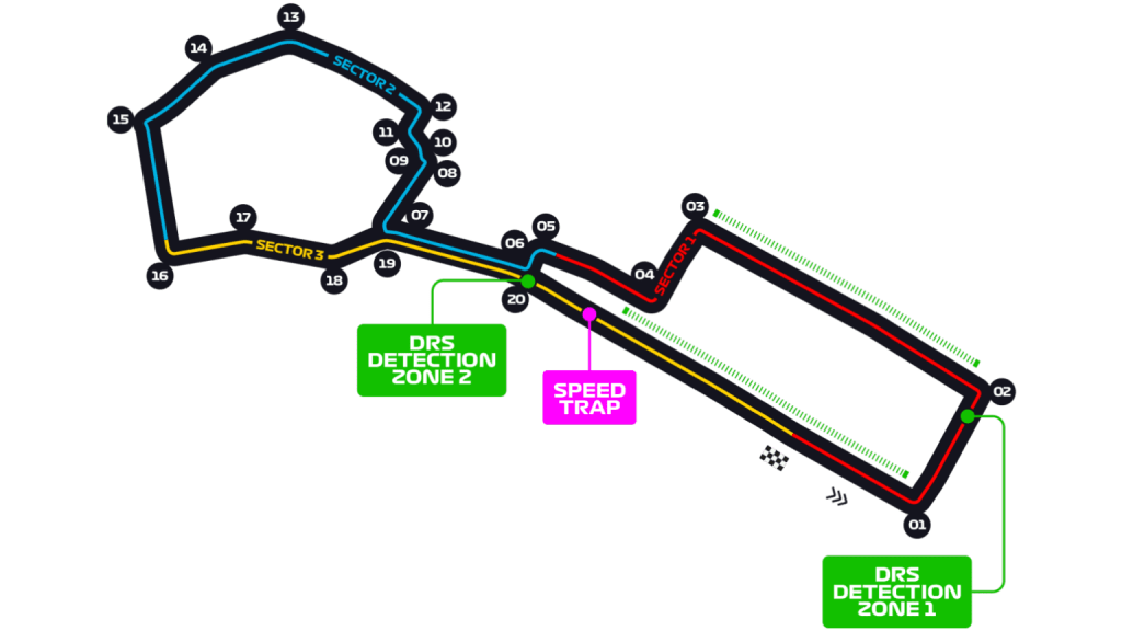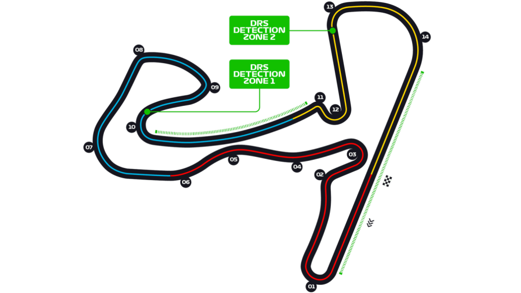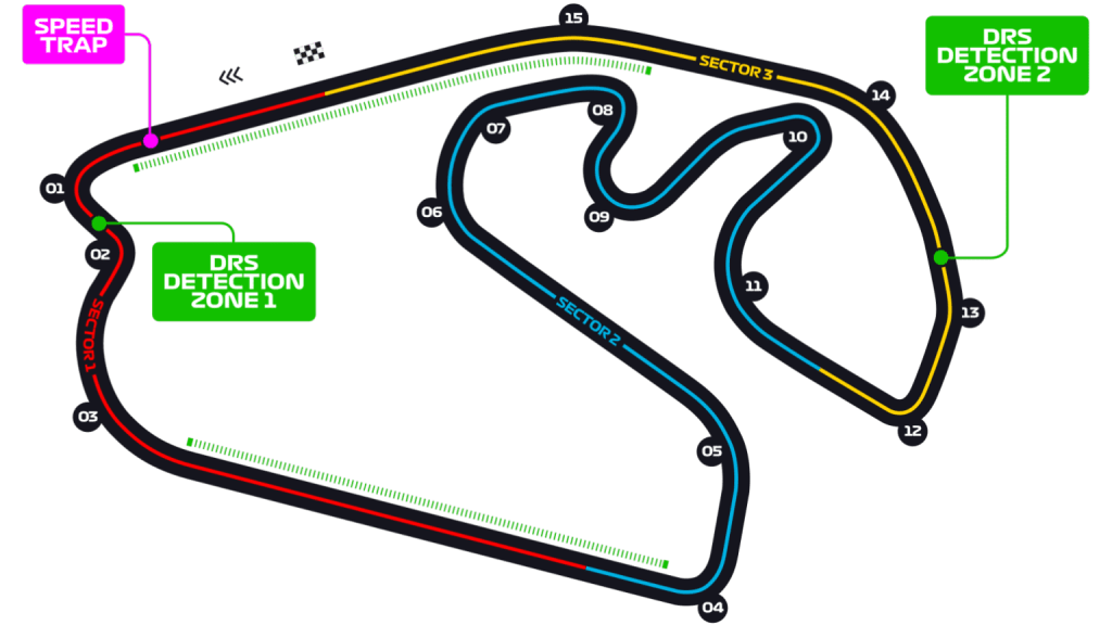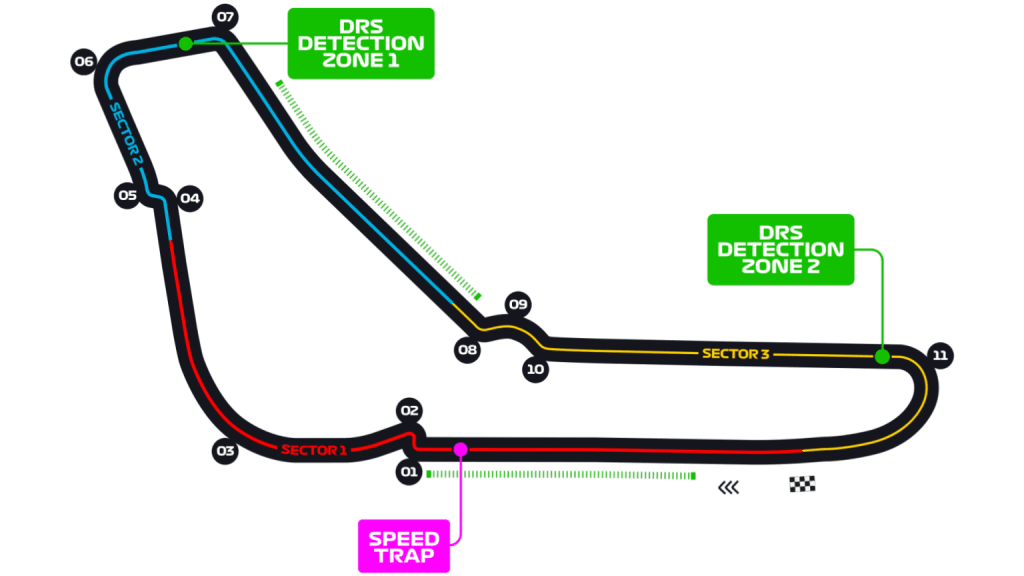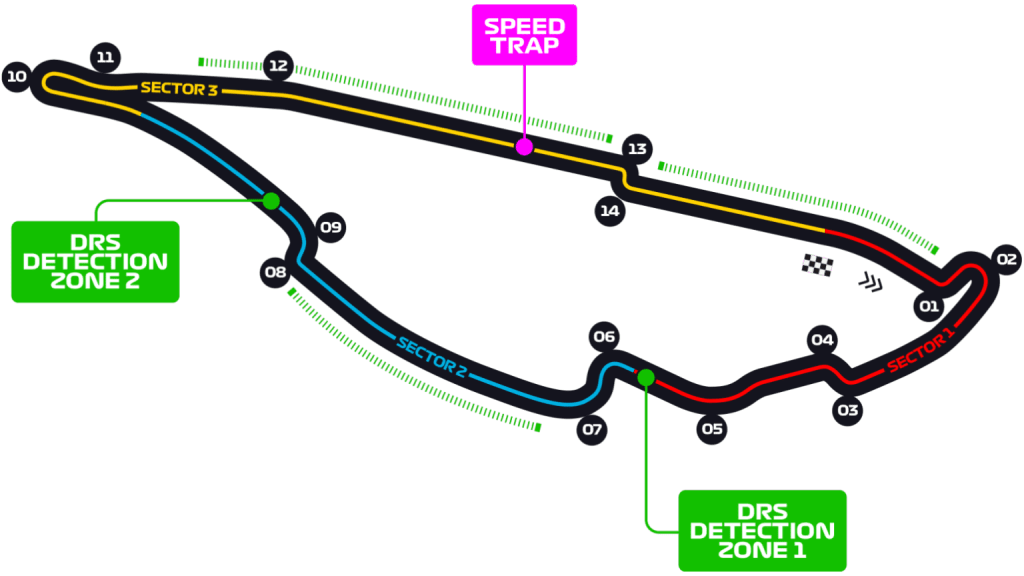 The heavy braking zones at Turn 11 and Turn 12 create key overtaking opportunities while the final sector demands traction and precise throttle control. Tyre wear can be high depending on track temperature, and bumps on the surface often influence mechanical setup. Teams must find a compromise between straight line efficiency and grip through the fast corners.